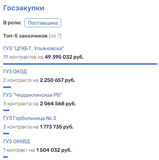 На сайте госзакупок можно найти множество электронных аукционов Центральной городской больницы Ульяновска, где победителем является коммерсант Волков. Средняя цена лота варьируется от 1,4 до 1,9 миллиона рублей. Итогом торгов стали многочисленные госконтракты, заключенные между политиком-главврачом Фирсовым и молодым бизнесменом. В основном это поставка изделий медицинского назначения для лабораторной диагностики.