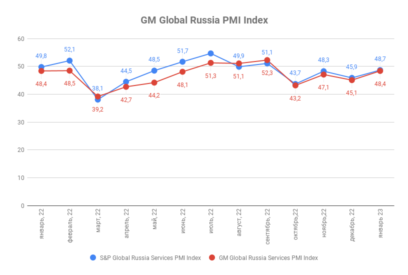 Январское значение индекса деловой активности ГлобалМедиа PMI (GM Global Services Russia PMI Index) составило 48,4 п.п. против 45,1 п.п . в декабре. Значение индекса деловой активности в сфере услуг от S&P Global (Global Russia Services PMI by the S&P Global) за аналогичный период выросло с 45,9 п.п. до 48,7 п.п.