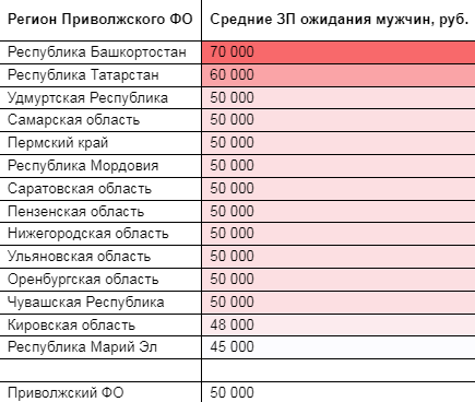 Уровень средних ожидаемых заработных плат мужчин Ульяновской области, согласно данным из резюме, составил 50 тысяч рублей.