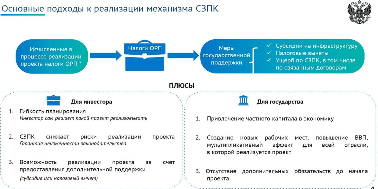 В настоящее время возможность заключения СЗПК с участием Российской Федерации прорабатывается в отношении новых инвестпроектов.