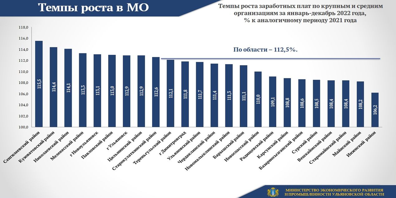 «Самые высокие заработные платы сложились в Ульяновске (48,7 тысячи рублей), Димитровграде (48,3 тысячи рублей), Чердаклинском районе (44,9 тысячи рублей), Новоульяновске (41,4 тысячи рублей) и Новоспасском районе (40,4 тысячи рублей). Быстрее всех они росли в Сенгилеевском (115,5% к уровню 2021 года), Кузоватовском (114,4%), Николаевском (114,1%), Мелекесском (113,3%) районах. Самые высокие новогодние премии получили жители Димитровграда. Средний заработок в городе составил в декабре рекордные для региона 71629 рублей», — сообщил Министр экономического развития и промышленности Ульяновской области Николай Зонтов.