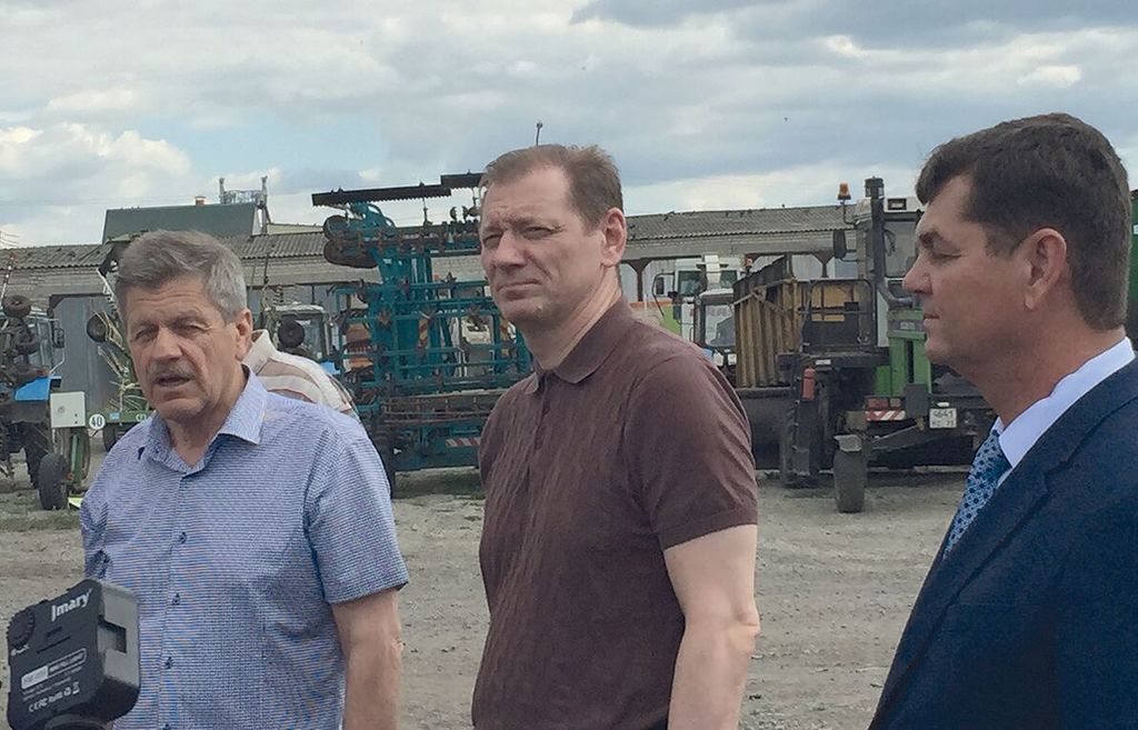 Из средней школы села Ермоловка глава кабинета министров Владимир Разумков в сопровождении председателя СПК (колхоз) имени Калинина Ряхима Камаева отправился на машинный двор сельскохозяйственного кооператива, где встретился со свободными от работы в поле механизаторами и проконтролировал качество подготовки к уборочной кампании.