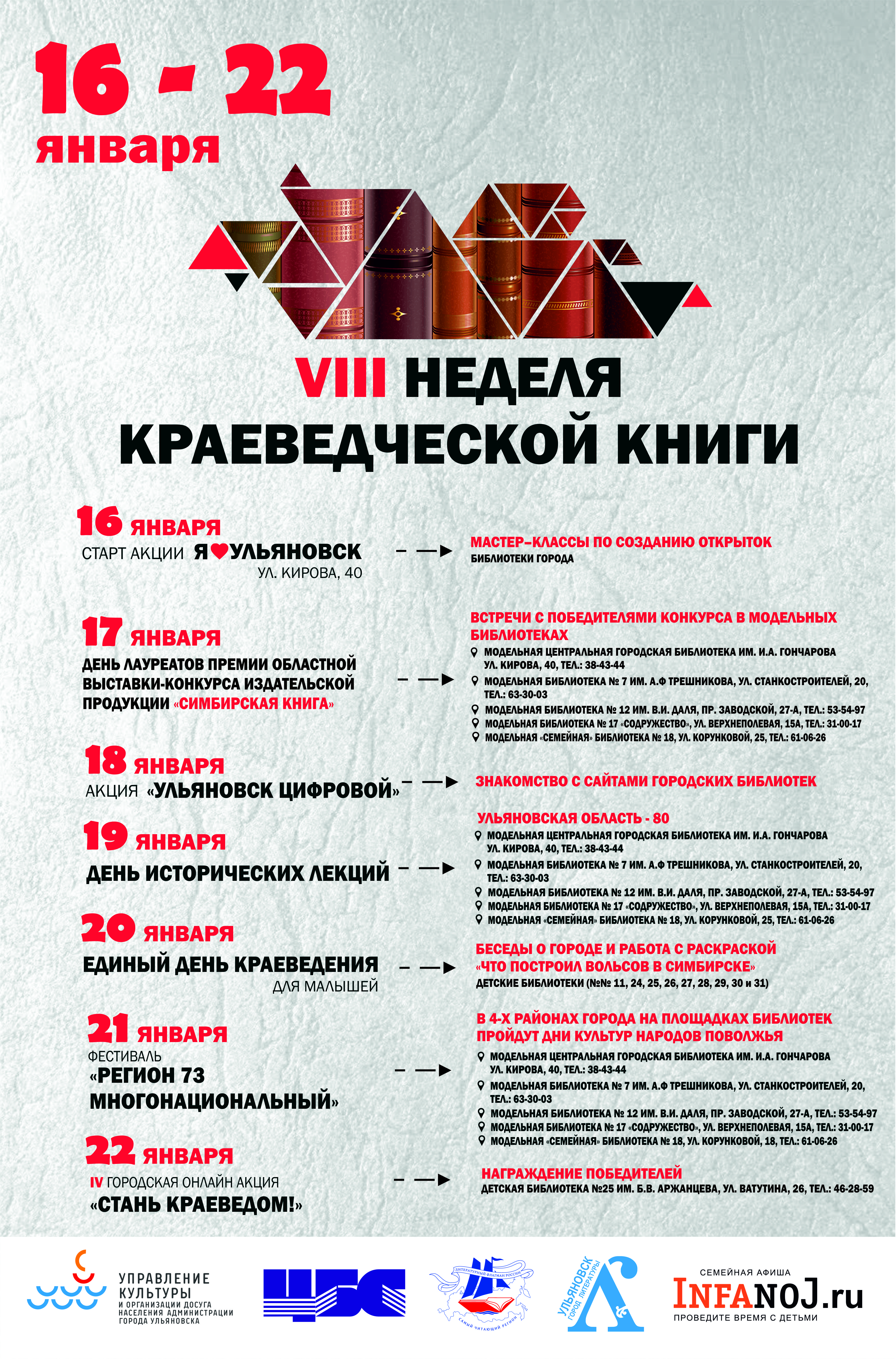16 января 2023 года во всех библиотеках города стартует VIIIНеделя краеведческой книги, посвященная 80-летию со Дня образования Ульяновской области и 375-летию Симбирска-Ульяновска.