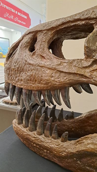 Сразу привлекают внимание реконструкции черепа тираннозавра и трицератопса в натуральную величину (длина около 1,2 метра). Отличительная особенность тираннозавра от других хищных динозавров - самое сильное сжатие челюстей.
