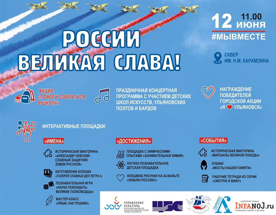 12 июня, в День России, городские библиотеки проведут интерактивную познавательную программу «России великая Слава!» в сквере имени Н.М. Карамзина.