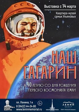 14 марта в 14.00 в Квартире-музее семьи Ульяновых открывается выставка «Наш Гагарин», посвящённая юбилейной дате – 90-летию со дня рождения Ю. А. Гагарина (6+).