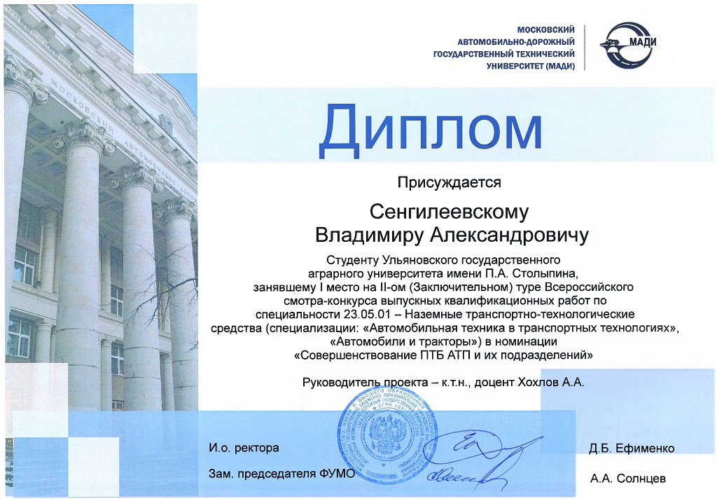 Представители государственного аграрного университета имени П.А. Столыпина стали победителями Всероссийского смотра-конкурса ВКР по специальности «Наземные транспортно-технологические средства» по различным номинациям.
