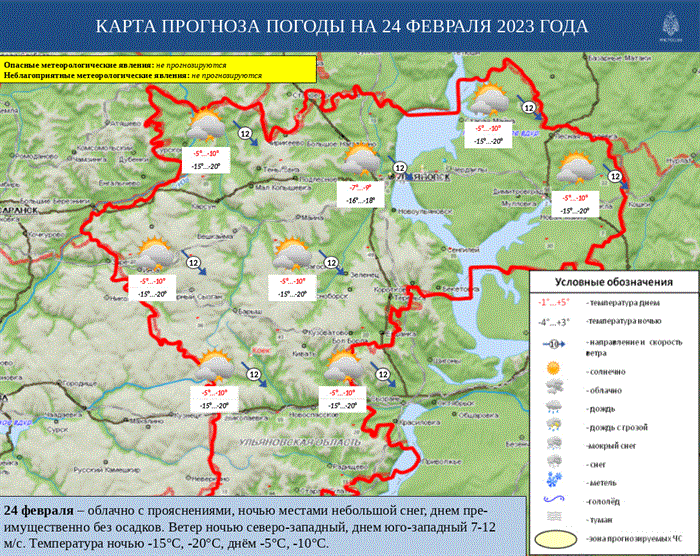 По данным специалистов Ульяновского центра по гидрометеорологии и мониторингу окружающей среды, 24 февраля на территории нашего региона ожидается облачная погода с прояснениями. Днем осадки маловероятны. Ветер днем будет дуть юго-западный, со скоростью 7-12 метров в секунду. Температура воздуха днём от -5°С до -10°С.
