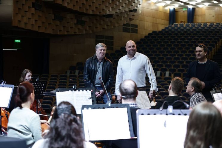 Губернатор Ульяновской области Алексей Русских (на фото — в центре) встречается с коллективом Ульяновского государственного академического симфонического оркестра, апрель 2023 года. Правее на фото — дирижер Эдуард Дядюра и директор «Губернаторского» Владимир Мельниченко