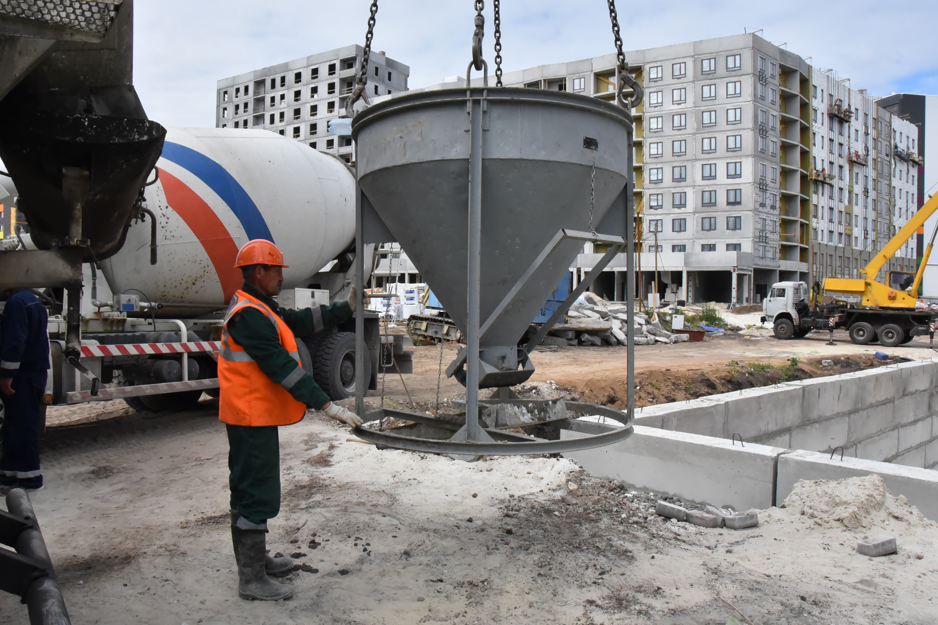 Сейчас на строительной площадке трудятся 25 специалистов, задействованы три крана, экскаватор и автобетоносмесители.