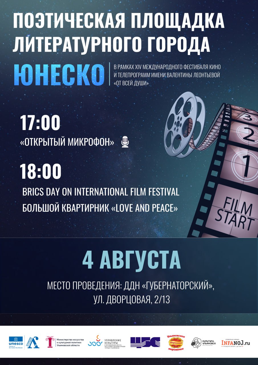 4 августа в 17:00 на территории Дворца дружбы народов «Губернаторский» пройдет поэтический микрофон и квартирник «Love and peace», где студенты из Индии, Йемена, Египта и Азербайджана представят свои национальные танцы и музыкальные номера с исполнением песен на русском, английском и родном языке. Позже они побывают на показе фильма «Достоевский межконтинентальный».