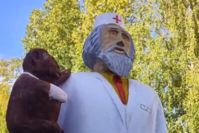 Ульяновский мастер-резчик уже закончил непростую работу, дополнив исходную композицию фигуркой обезьянки и попугая на медицинском чемоданчике. Обновленный деревянный памятник уже красуется на своем прежнем месте.