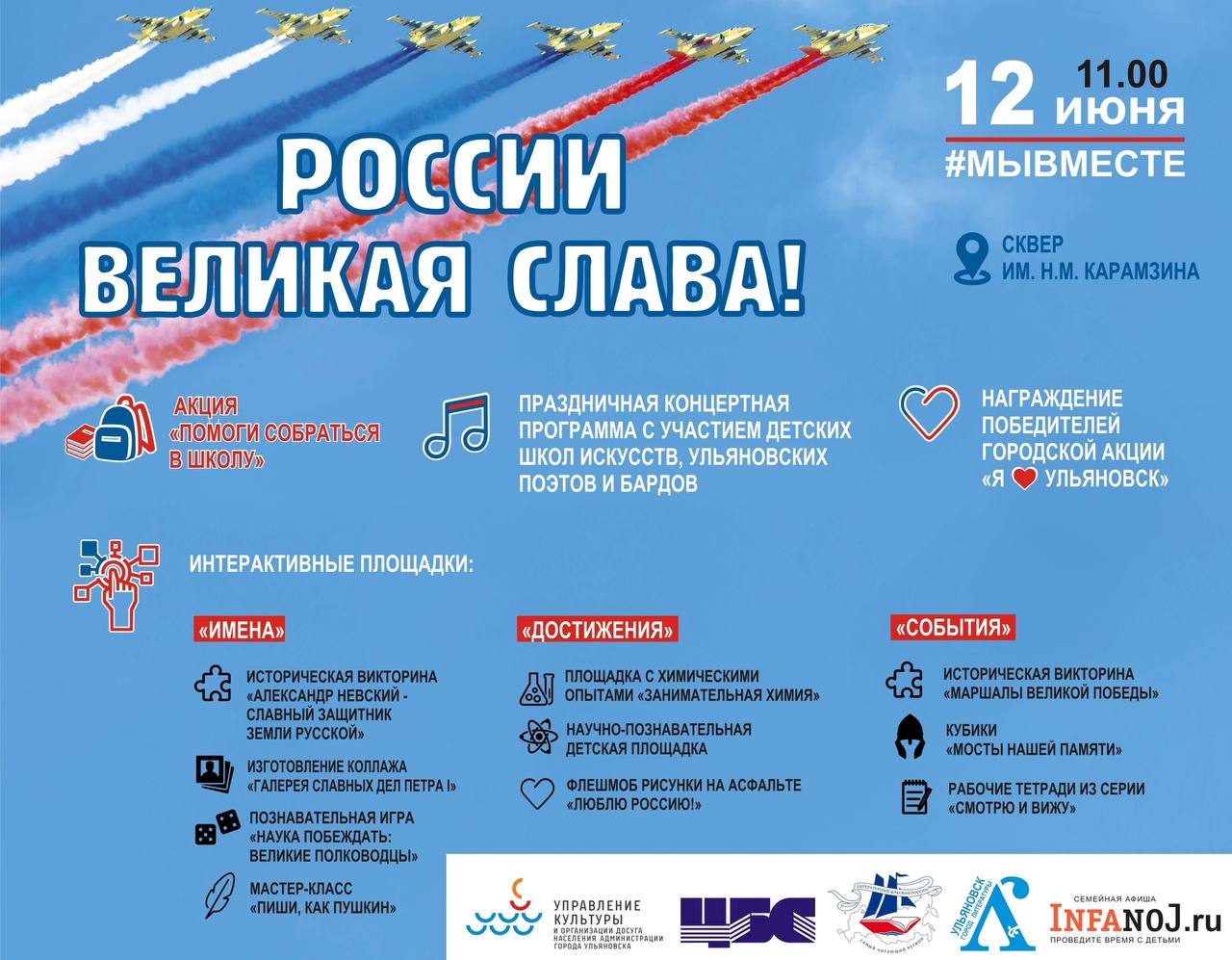 В День России с 11:00 до 15:00 в сквере Карамзина пройдёт интерактивная познавательная программа «России великая Слава!».