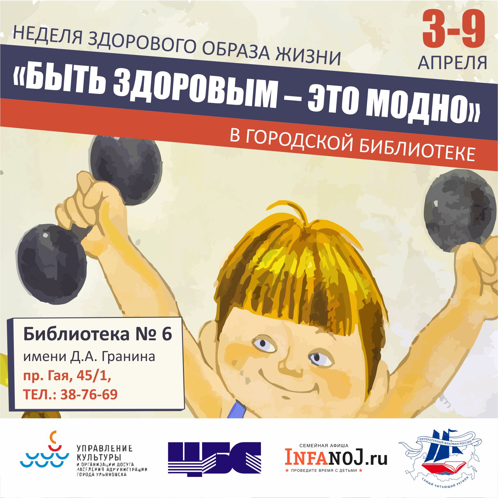 С 3 по 9 апреля в библиотеке №6 имени Д.А. Гранина (пр-т Гая, 45/1) организована Неделя здорового образа жизни «Быть здоровым – это модно» в рамках объявленного Года корпоративного спорта в Ульяновской области.