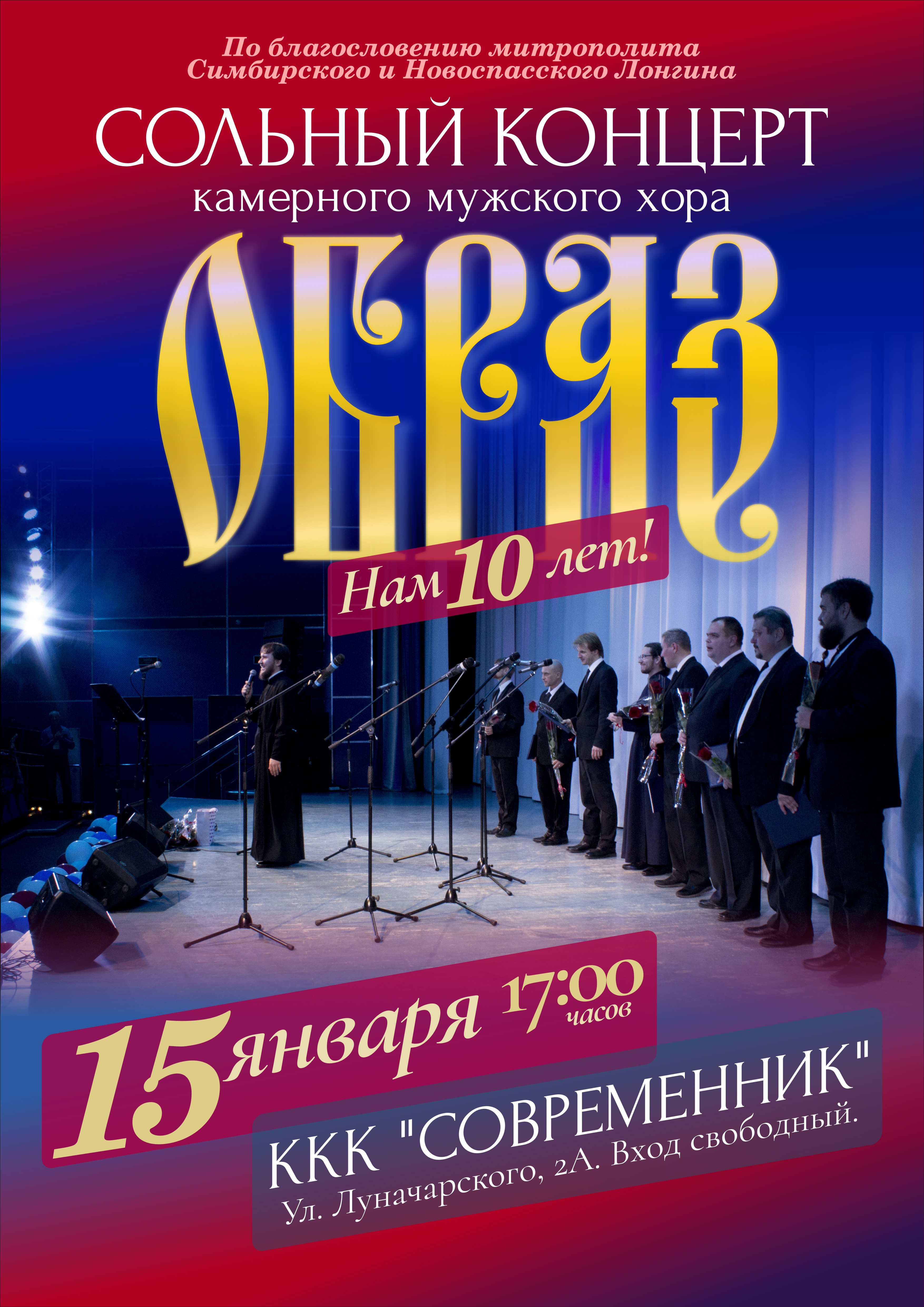 По благословению Митрополита Симбирского и Новоспасского Лонгина 15 января в киноконцертном комплексе “Современник” состоится юбилейный концерт камерного мужского хора «Образ». В программе концерта православная духовная музыка, а также русские народные и патриотические песни.