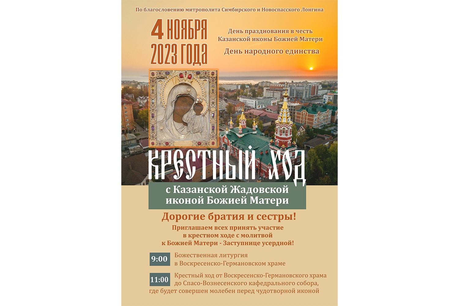 По благословению Митрополита Симбирского и Новоспасского Лонгина в день празднования в честь Казанской иконы Божией Матери (День народного единства) в Ульяновске состоится крестный ход с Казанской Жадовской иконой Божией Матери.