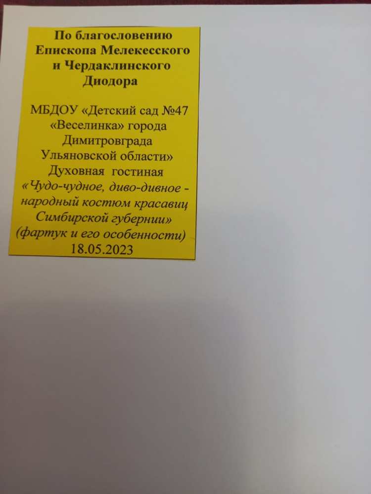 В рамках участия МБДОУ "Детский сад 47 "Веселинка" в 10 юбилейном федеральном научно-общественном конкурсе "Восемь жемчужин дошкольного образования -2023" прошла духовная гостиная "Добронравие" на тему: "чудо чудное, диво дивное - народный костюм красавиц Симбирской губернии" (фартук и его особенности) в проекте сетевого межрегионального взаимодействия по направлению: "Мастерство Народных промыслов- детям".