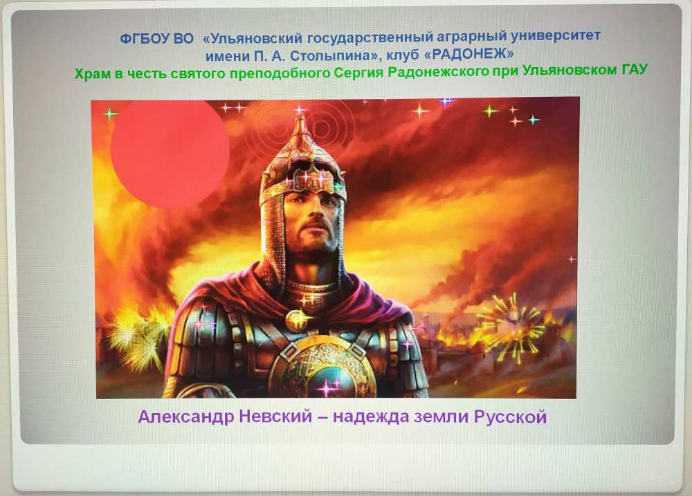 Накануне праздника святого благоверного великого князя Александра Невского 11 сентября 2023 года в Ульяновском государственном аграрном университете имени П. А. Столыпина на кураторском часе в 2-х группах со студентами проведена беседа на тему: «Александр Невский – надежда Земли русской». Организаторами выступили члены духовно-патриотического клуба «Радонеж» УлГАУ.