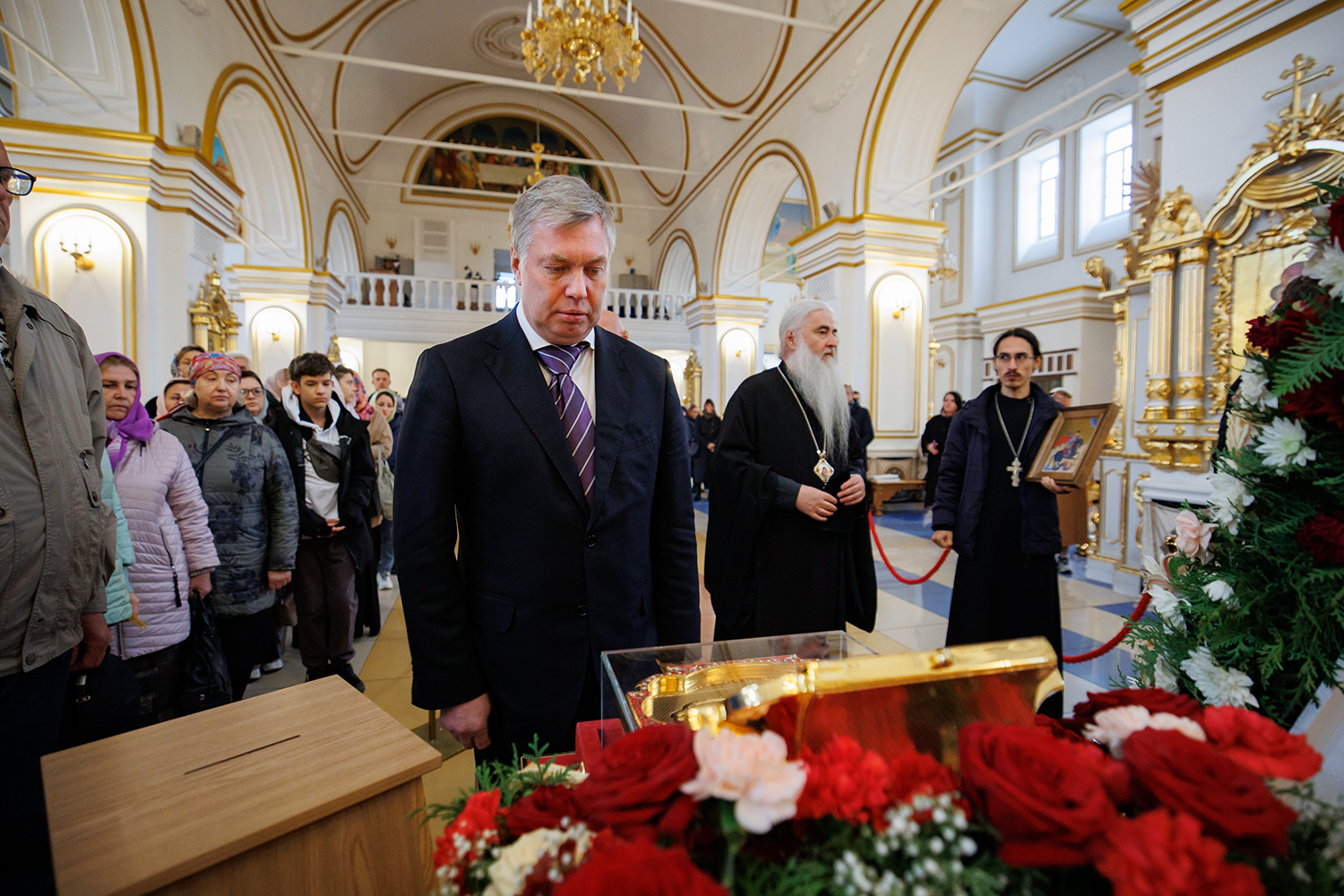 Глава региона помолился святому великомученику Георгию Победоносцу у прибывшей святыни, затем поклонился святому блаженному Андрею Симбирскому, мощи которого пребывают в соборе.