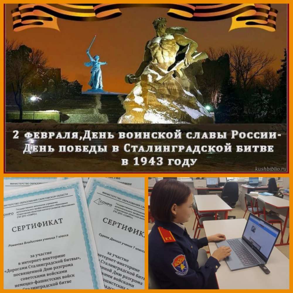 2 февраля 2023 года кадеты 7 класса (кл. Руководитель Братикова И.О.) Бряндинской средней школы прошли интернет-викторину "Дорогами Сталинградской битвы", посвященную Дню воинской славы России – Дню разгрома советскими войсками немецко-фашистских войск в Сталинградской битве.