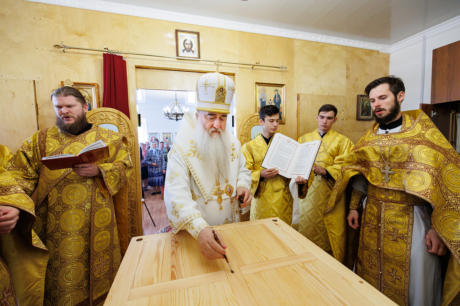— Сегодня нам часто приходится служить в переоборудованных помещениях. Здесь храм обустроен в здании дореволюционной постройки. И сегодня, когда окончился его ремонт и благоукрашение, мы совершаем Великое освящение — особый, очень древний чин, — сказал, обратившись к собравшимся прихожанам, Митрополит Лонгин. — Во время этого чинопоследования мы молимся о том, чтобы Господь из прежде обычного здания сотворил «селение славы Своей», чтобы оно стало местом молитвы, где человек встречается с Богом в таинствах Церкви. Будем молиться о том, чтобы Господь благословил тех людей, которые созидали этот храм, и утвердил его до скончания века; чтобы никогда больше люди не разрушали свои святыни, как произошло ХХ веке.