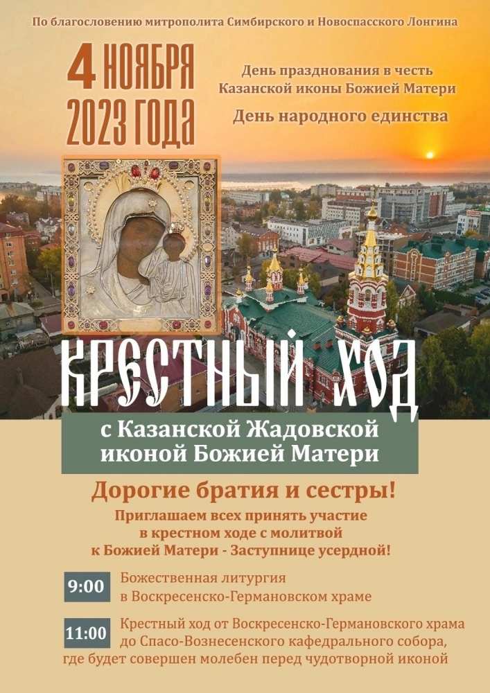 Дорогие братия и сестры! В 4 ноября 2023 года, день празднования Казанской иконы Божией Матери, в день народного единства, приглашаем вас принять участие в крестном ходе с молитвой к Божией Матери - Заступнице усердной.