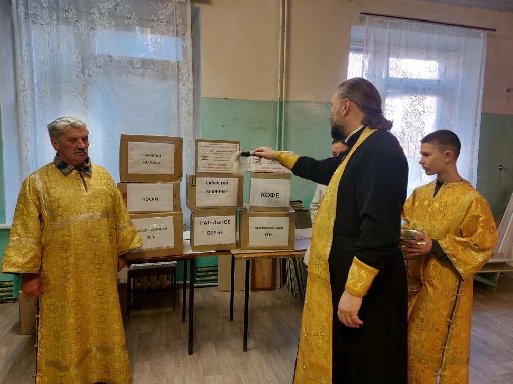 Прихожанами храма и жителями поселка закуплены и собраны к отправке в пункте гуманитарной помощи для воинов все необходимое. Перед отправкой автомашины с грузом настоятель храма иеромонах Иона (Черкасов) освятил гуманитарную помощь.