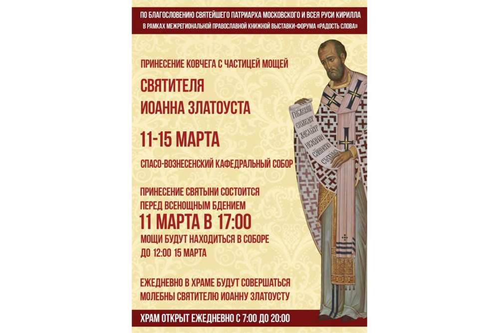 По благословению Святейшего Патриарха Московского и всея Руси Кирилла, в рамках межрегиональной православной книжной выставки-форума "Радость Слова", 11 марта в 17-00 перед Всенощным Бдением в Спасо-Вознесенском кафедральном соборе г. Ульяновска состояится принесение ковчега с частицей мощей Святителя Иоанна Златоуста. Мощи будут находиться в соборе до 12-00 15 марта.