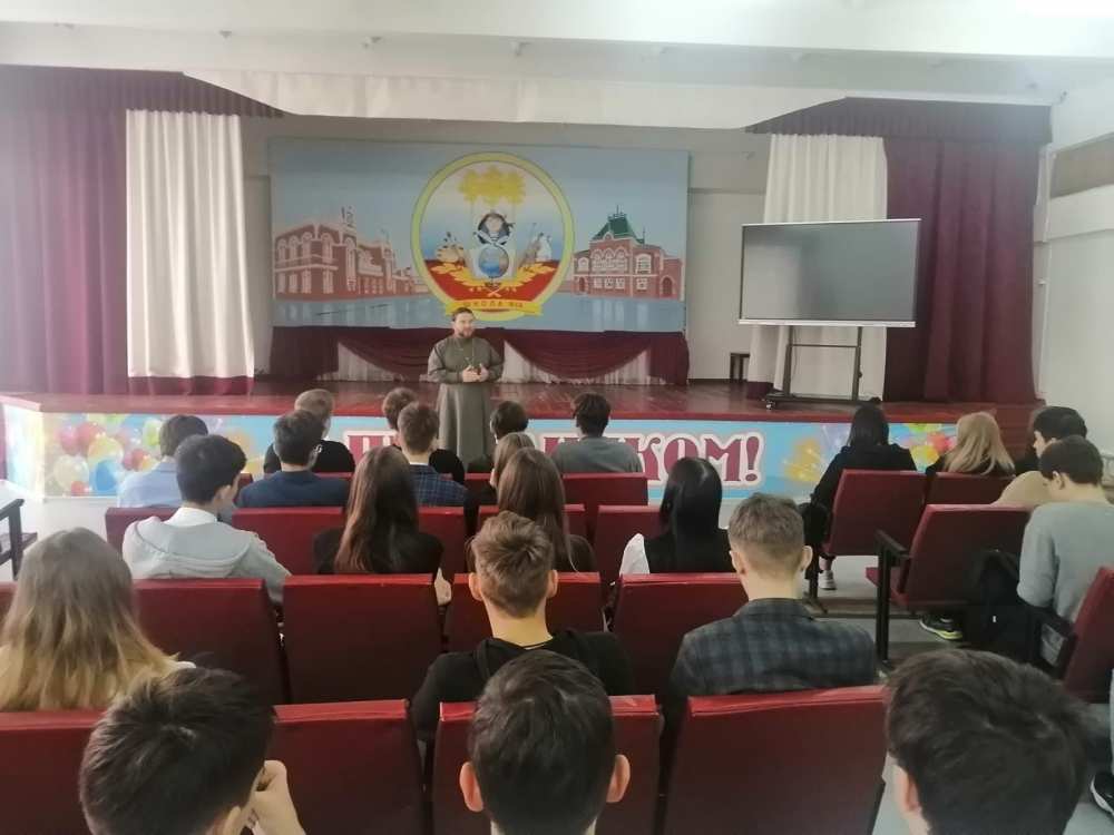Урок был посвящён поиску смысла жизни и значению каждого совершаемого нами поступка. Отец Пётр отметил важность подобных встреч с ребятами, именно в тот момент, когда у них переходный возраст, когда возникает много вопросов, касающихся отношений в семье, с окружающими, вопросов личной жизни. На простых и ярких примерах батюшка объяснил детям православное понимание извечных вопросов человеческого бытия: что есть добро и зло, что такое совесть, какую роль она играет в жизни каждого человека. Рассказал ребятам о взаимоотношениях в семье, о том, что любовь к своим ближним нужно воспитывать, прежде всего, в семье. Сделал акцент на том, что в первую очередь нужно любить и уважать своих родителей.