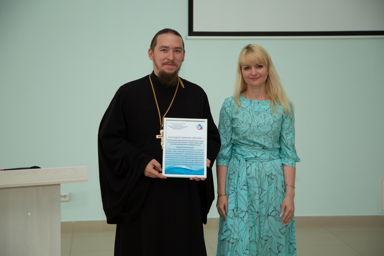 Главный врач городской клинической больницы святого апостола Андрея Первозванного Александра Верушкина вручила отцу Роману благодарственное письмо за активное взаимодействие с учреждением и реализацию проекта «Спасибо, Мама!»