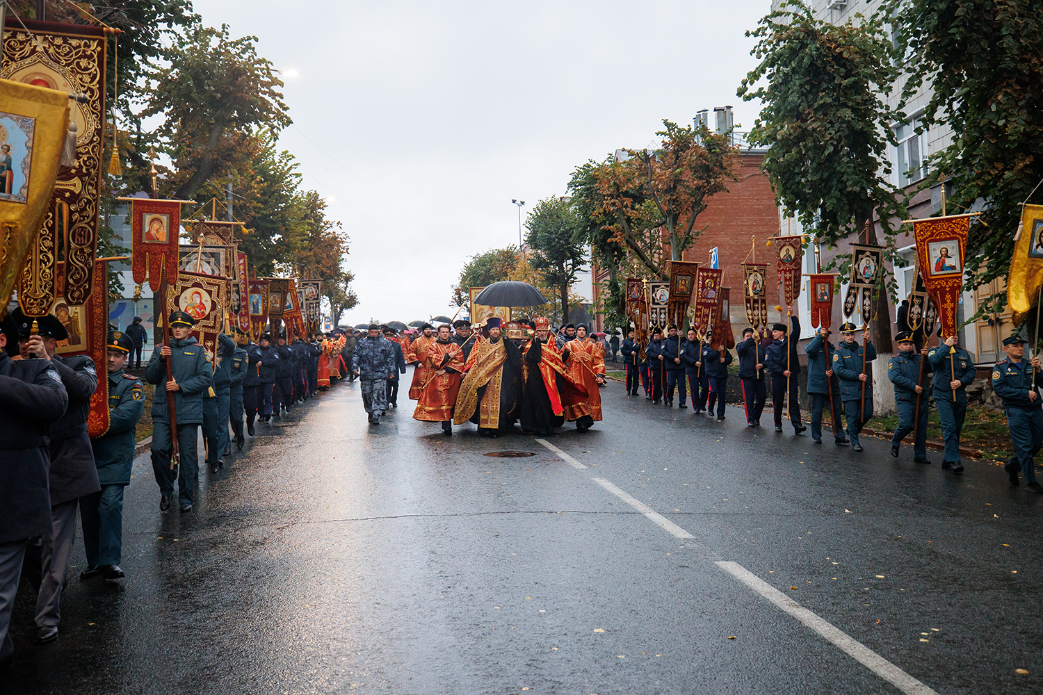 Во главе крестного хода прошли сотрудники МВД во главе с начальником УМВД по Ульяновской области генерал-майором Максимом Петрушиным, сотрудники МЧС во главе с начальником ГУМЧС по Ульяновской области Михаилом Осокиным, военнослужащие 345 полка 104-й десантно-штурмовой дивизии ВДВ во главе с полковником Игорем Солдатовым, сотрудники УФСИН по Ульяновской области во главе с начальником ОРЛС Василием Кудряшовым, казаки Симбирского окружного казачьего общества ВВКО во главе с атаманом Сергеем Дедюевым, курсанты УИГА, воспитанники суворовского училища.