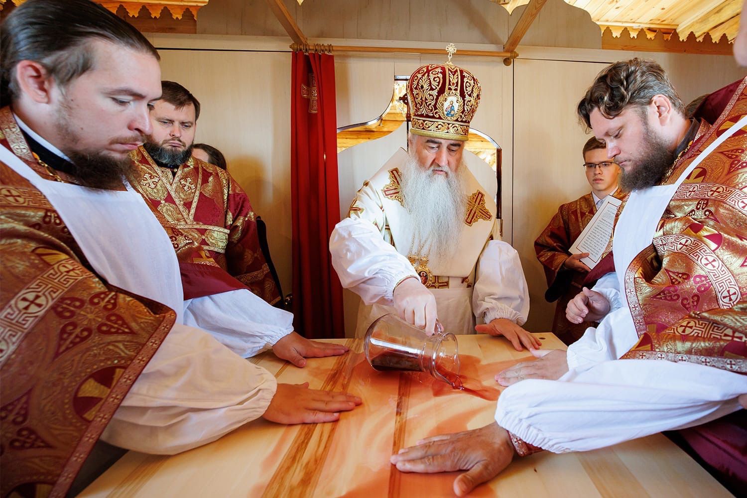 Праздничную литургию проводил Митрополит Симбирский и Новоспасский Логнин. В алтаре престол забили гвозди его преосв, скрепляющие его. По традиции для этого вместо молотков используют камни. Престол поливают воскомастихом - сложным клейким составом из расплавленного воска, мастики, мраморной крошки и благовоний. Его омывают розовой водой, помазывают святым миром, а затем облачают в несколько слоев «одежд». И наконец, возлагают антиминс. Храм и все его убранство окадили и окропли святой водой. Во время чина освящения храма прочитали молитвы, главная мысль которых – просьба ко Господу даровать освящаемому храму и молящимся в нем Божественную благодать.