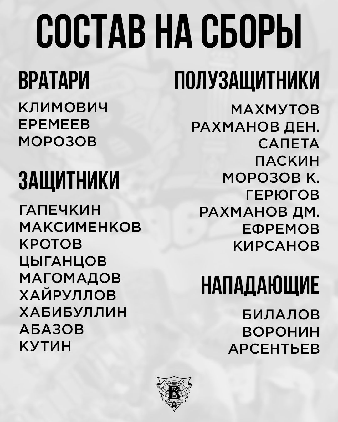 На сборе проведены первые тренировки. Под руководством штаба Сергея Жукова занимаются 23 футболиста из текущей заявки на чемпионат плюс недавно пополнивший стан "жёлто-чёрных" Никита Кирсанов.