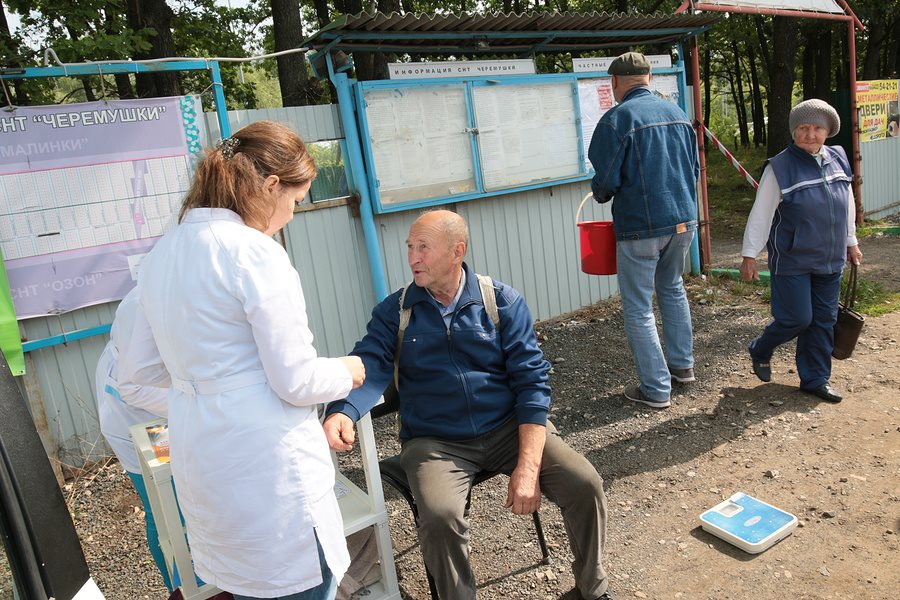 Из 18 обследованных садоводов 83% имеют повышенное артериальное давление, а половина - лишний вес. По результатам медосмотров садоводы получили консультацию терапевта по коррекции факторов риска хронических неинфекционных заболеваний, а также научились правильно измерять артериальное давление и оказывать первую помощь при сердечных катастрофах.