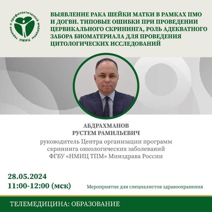 28 мая в 11.00 (время московское!) состоится образовательный семинар «Выявление рака шейки матки в рамках ПМО и ДОГВН.