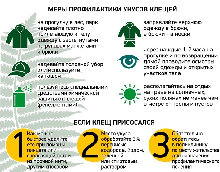 Собираясь в лес, постарайтесь защитить себя от нападения клеща: наденьте одежду с длинными рукавами, плотно прилегающими к запястью; брюки заправьте в высокие сапоги (обувь должна закрывать тыл стопы и лодыжку, давая возможность заправить в нее одежду); обязательно наденьте одежду с капюшоном; одежду выбирайте светлую, чтобы легче было заметить клеща; обработайте одежду и открытые части тела репеллентом, отпугивающим клещей; передвигаясь по лесу, старайтесь держаться середины тропинки, остерегайтесь высокой травы и кустарника. Клещ долго ищет место для укуса, поэтому при длительном нахождении в лесу или на даче необходимо проводить само- и взаимоосмотры каждые 2 часа. При возвращении домой следует просмотреть одежду и тело и принять душ. Следует также осматривать домашних животных после прогулки в лесной полосе и городских парках.