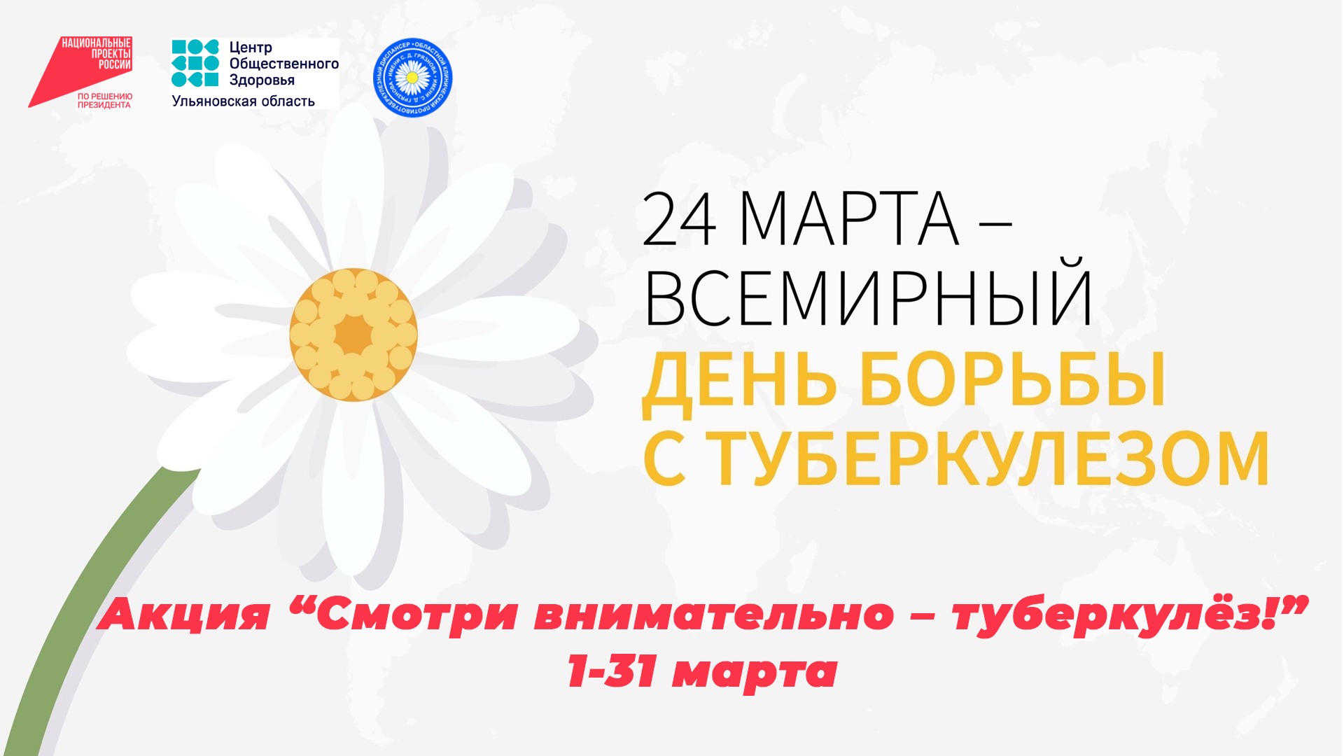 Мероприятия запланированы с 1 по 31 марта на территории Ульяновской области. Они направлены на повышение доступности и качества оказания медицинской помощи, снижение заболеваемости и смертности от туберкулёза, пропаганды здорового образа жизни среди населения в Ульяновской области и приурочены к Всемирному дню борьбы с туберкулезом – 24 марта.