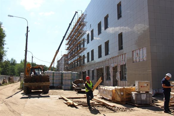 В настоящее время на объекте продолжаются масштабные работы по установке внутренних перегородок и отделке помещений, ведутся фасадные работы и монтаж инженерных сетей. Установлены практически все оконные блоки, внутри монтируются инженерные сети и перегородки, рабочие делают стяжку пола.