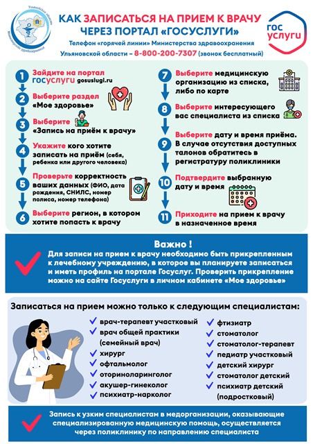 В Ульяновской области запись через Госуслуги доступна к врачам 14 специальностей: участковым терапевтам и педиатрам, врачам общей практики, хирургам, акушер-гинекологам, офтальмологам, оториноларингологам, стоматологам, стоматологам-терапевтам, детским стоматологам, детским и подростковым психиатрам, фтизиатрам, психиатрам-наркологам, детским хирургам.