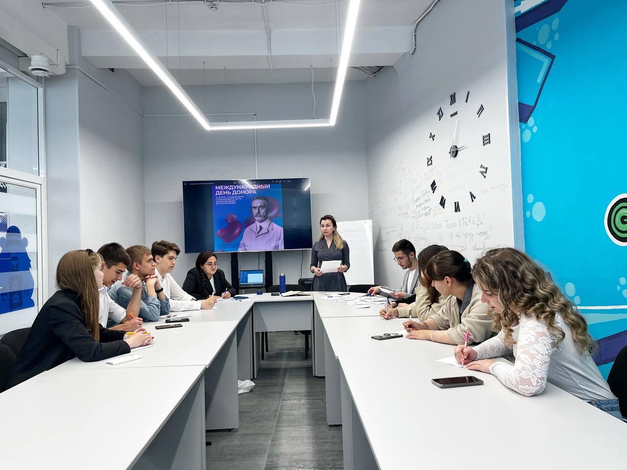 Одно из мероприятий прошло в Штабе общественной поддержки «Единой России». Активист МГЕР Эльвина Сайфуллина провела познавательную лекцию для 13 молодых людей по истории донорства и важности сдачи крови.