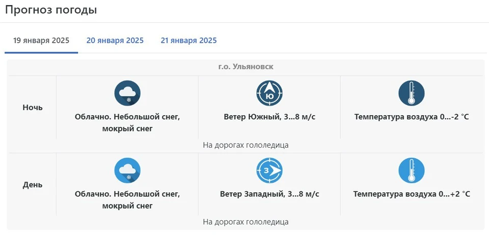 Прогноз погоды в Ульяновске на 19 января Прогноз погоды на 19 января По информации Приволжского управления по гидрометеорологии и мониторингу окружающей среды, в воскресенье, 19 января,